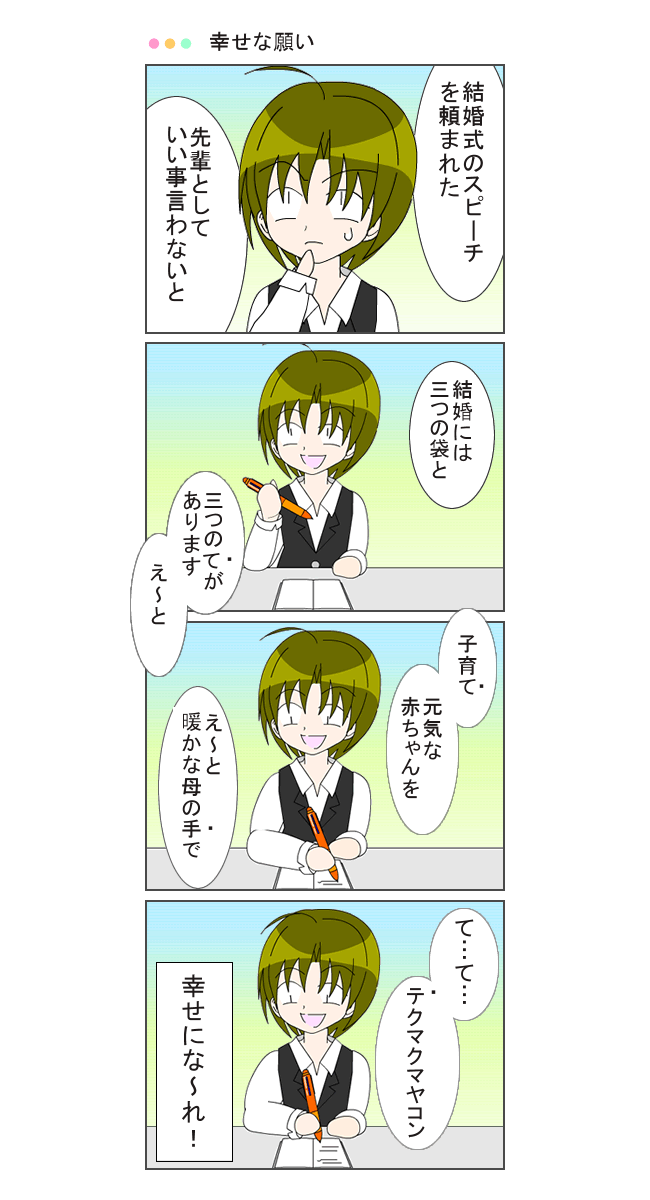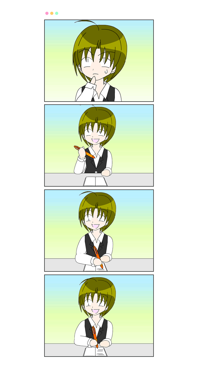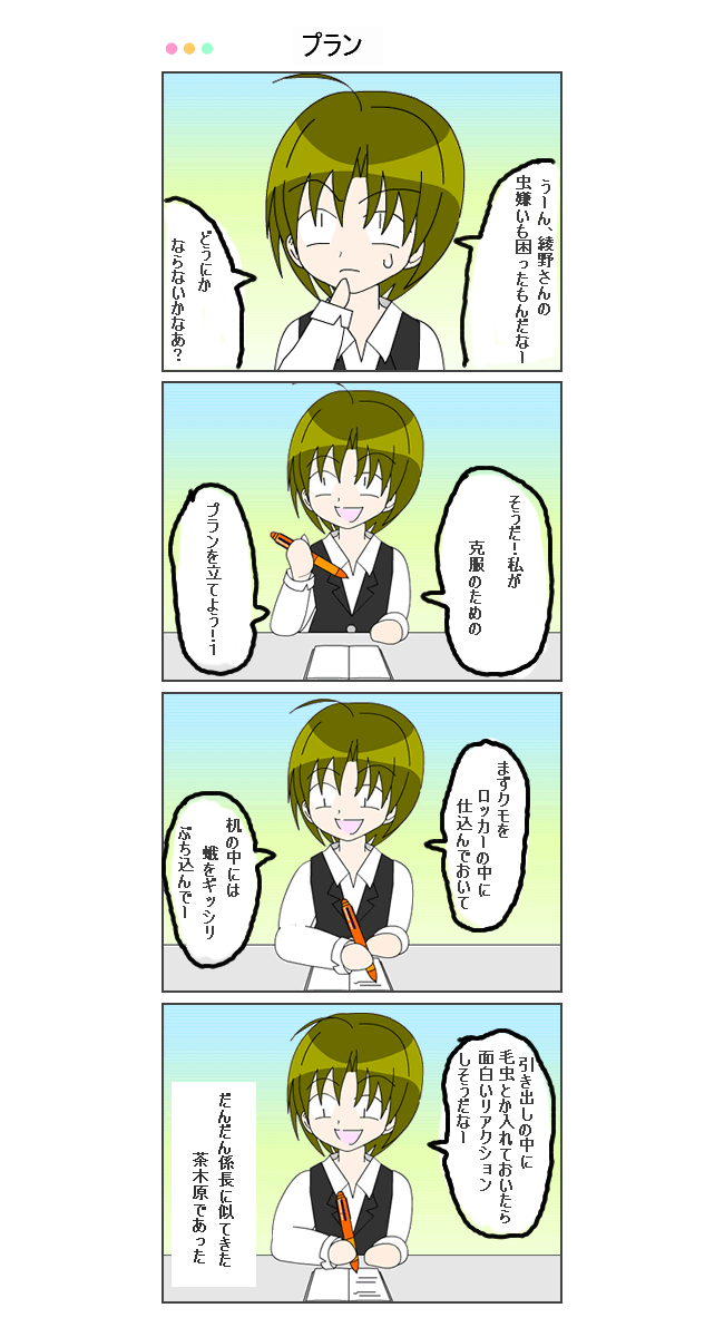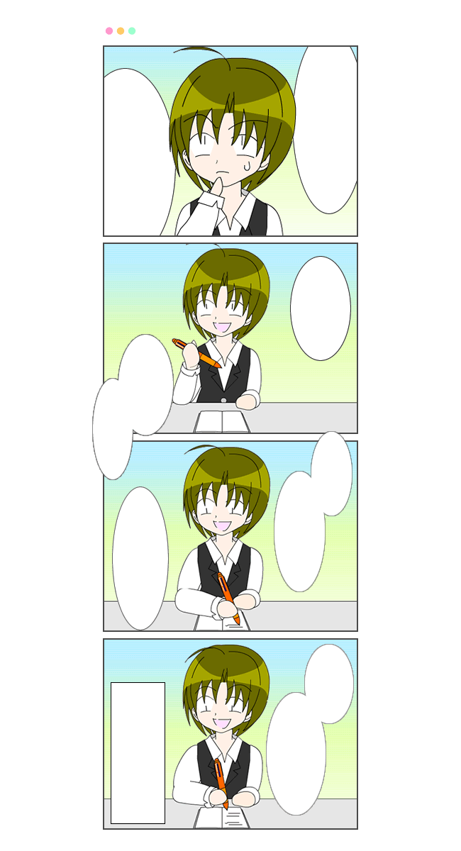 まず、私が4コマの絵だけを上げますので、それに台詞を書き足して下さい。